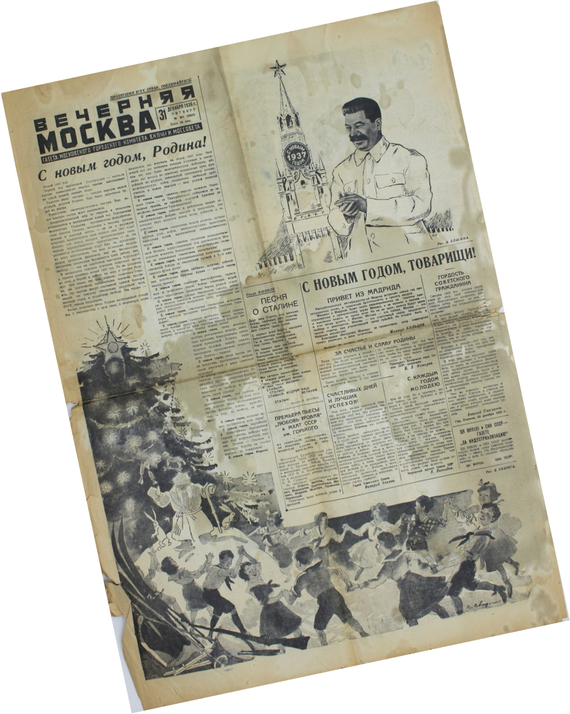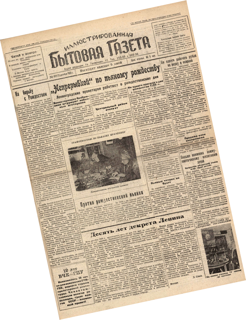 On the 30th of December the paper had published a photo of giant decorated New-Year tree in the shop “Detskiy Mir” with a whole article below about triumphant return of the tree on streets and flats throughout the country. «Yesterday there were a brisk trade of New-Year trees in almost every market in Moscow. Children's toy workshops began mass production of New-Year tree decorations...».